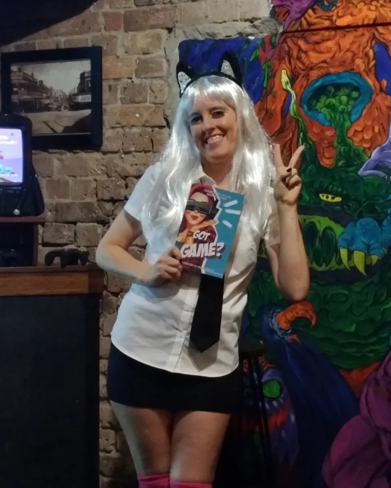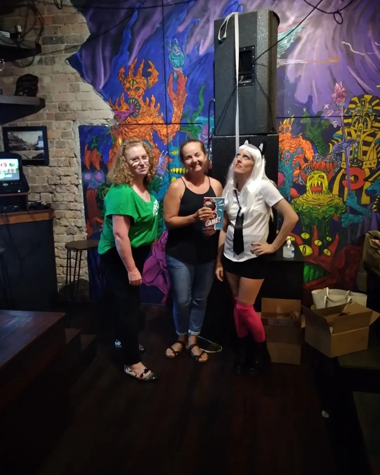 Last Sunday I cosplayed for the first time ever, as my own book character, co-created with my co-author Christine (the same one I co-host Write & Sip with), for the launch of Rainforest Writing Retreat 2022 anthology ‘Got Game?’ at Netherworld, a funky bar in Brisbane’s Fortitude Valley with an arcade, pinball machines & board games. Our short story, ‘Delete World’, is featured in the anthology.