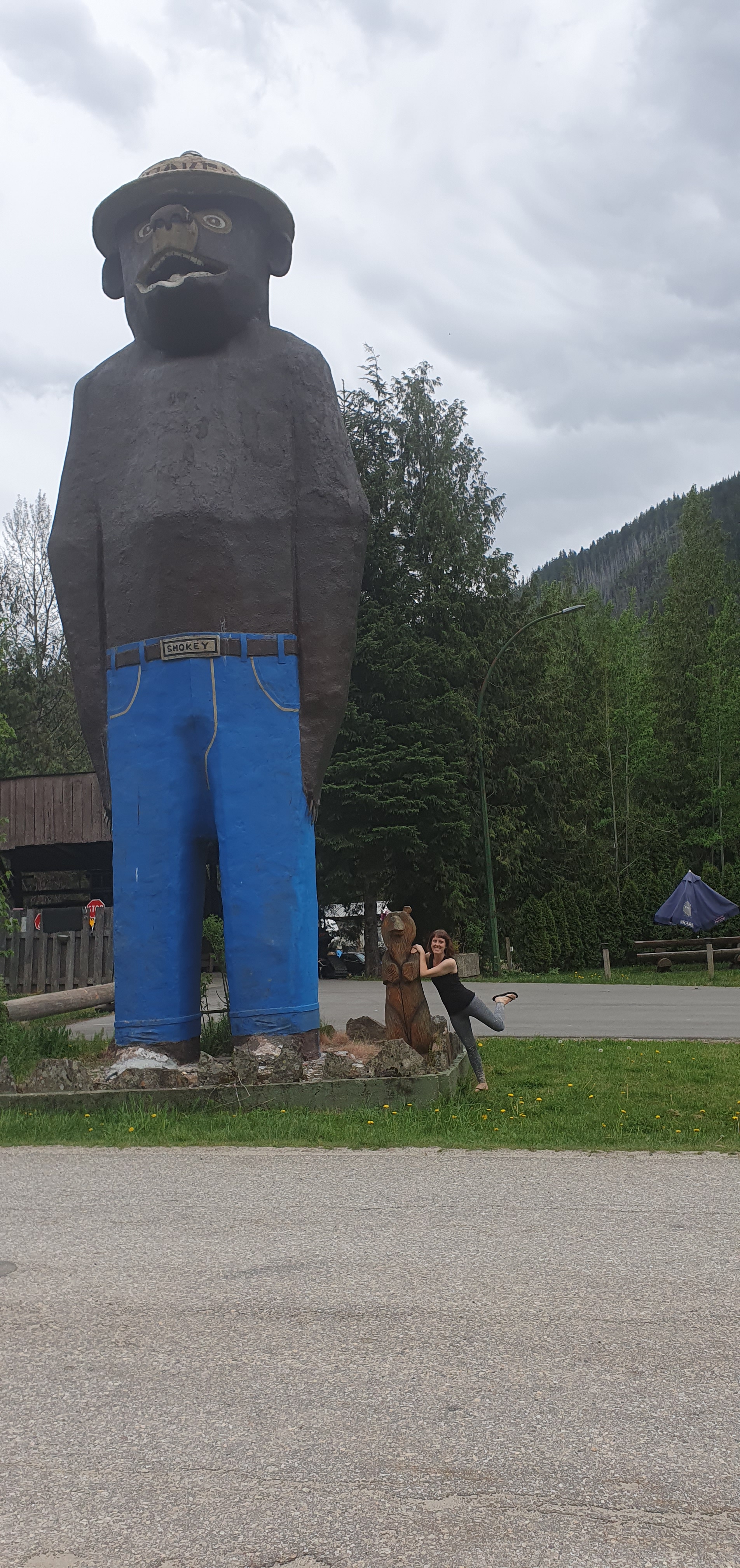 Over the next few hours, the sparkling lakes and rolling green hills of the Okanagan region gave way to rugged mountain ranges. We stopped briefly in Revelstoke- or Revy, as it’s affectionately known- outside the Smokey Bear Campground Resort for a photo with Smokey himself.