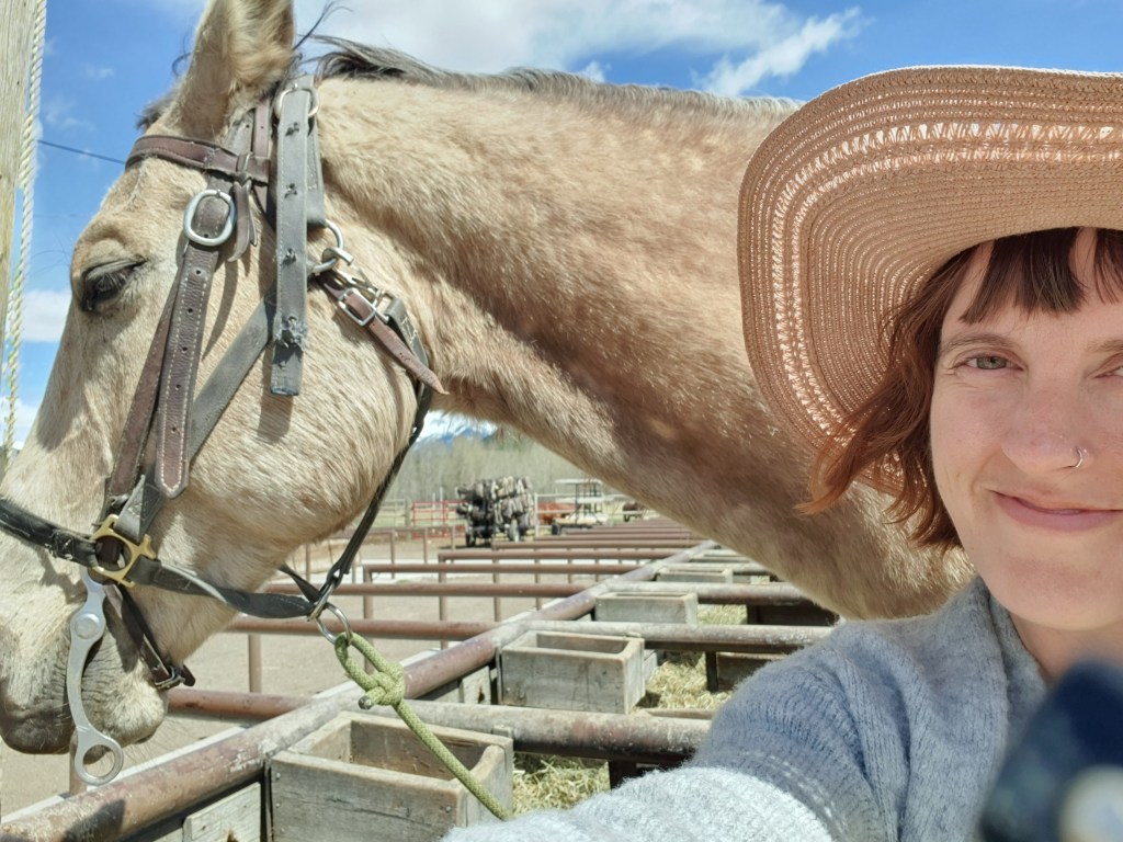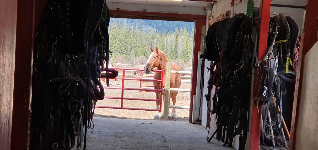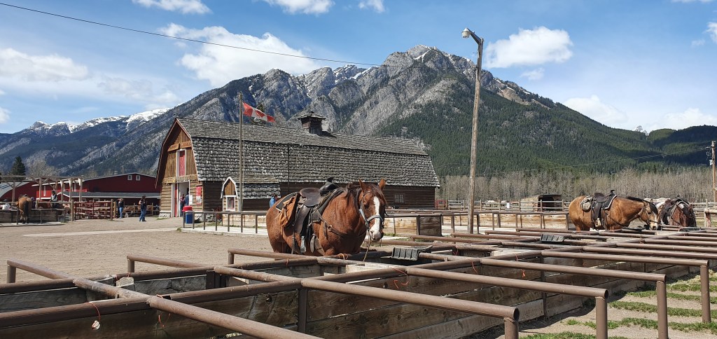 Our next stop was a surprise for Maddie, a twenty minute trail ride on a pony at Banff Trail Riders. She was a natural as she rode proudly in her saddle as she was led around the trail. Meanwhile, I made a friend.