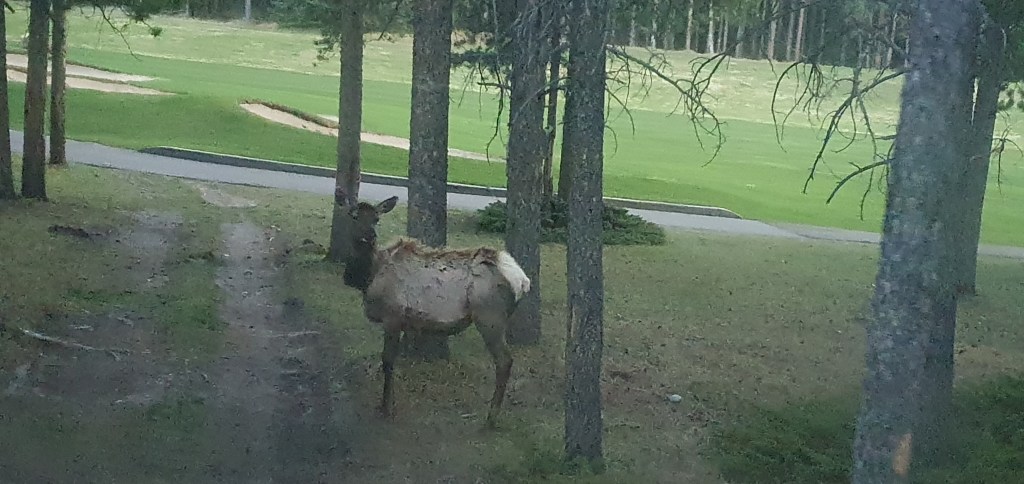 It was a late lunch in Canmore and the back to our accommodation. Janine and Maddie went to the pool while I booked a return bus ticket back into Banff to catch the evening safari tour I had booked for that night. I ventured back into town on my own and joined up the the tour. As the driver skilfully navigated the backroads of Banff behind the township and through the golf course, we kept a keen eye out for bear, moose, elk and wild sheep. The latter two were the only offerings we had that evening- as our guide said, it was not a zoo, and the wildlife did not operate on an appearance schedule. But the views were amazing.