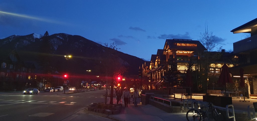 After the tour, I waited in town for the bus back to Canmore, watching the township illuminate as the sun went down. And I finally saw a moose!