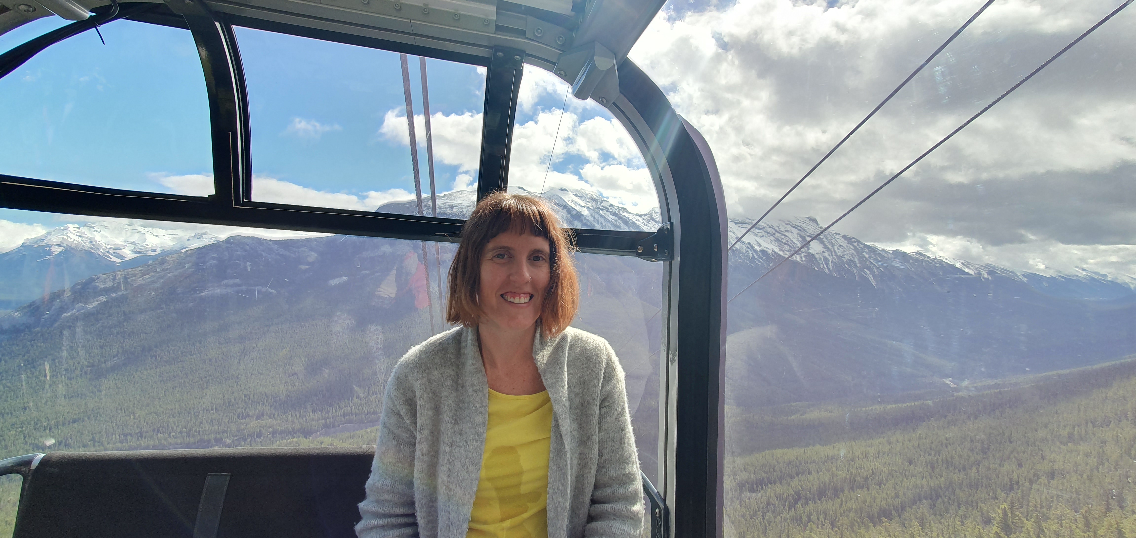 We started our second day in Banff National Park with a coffee from Starbucks, which I proceeded to spill over myself (evident in the photo below). We jumped on the gondola for a ride to the top of Sulphur Mountain. It was a beautiful sunny day, and we felt our stomachs churn with excitement and a little nervousness as we looked down over the treetops.