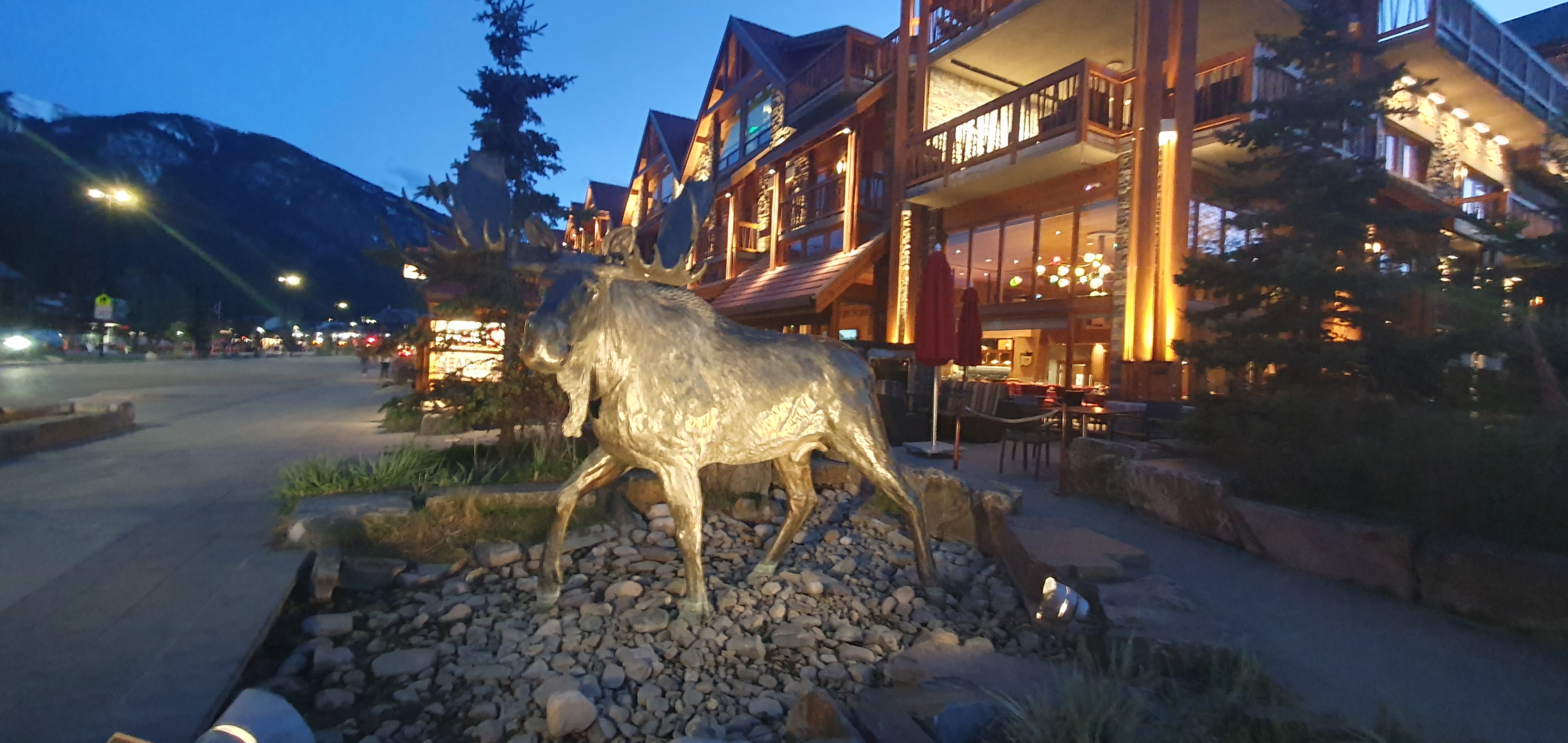 After the tour, I waited in town for the bus back to Canmore, watching the township illuminate as the sun went down. And I finally saw a moose!