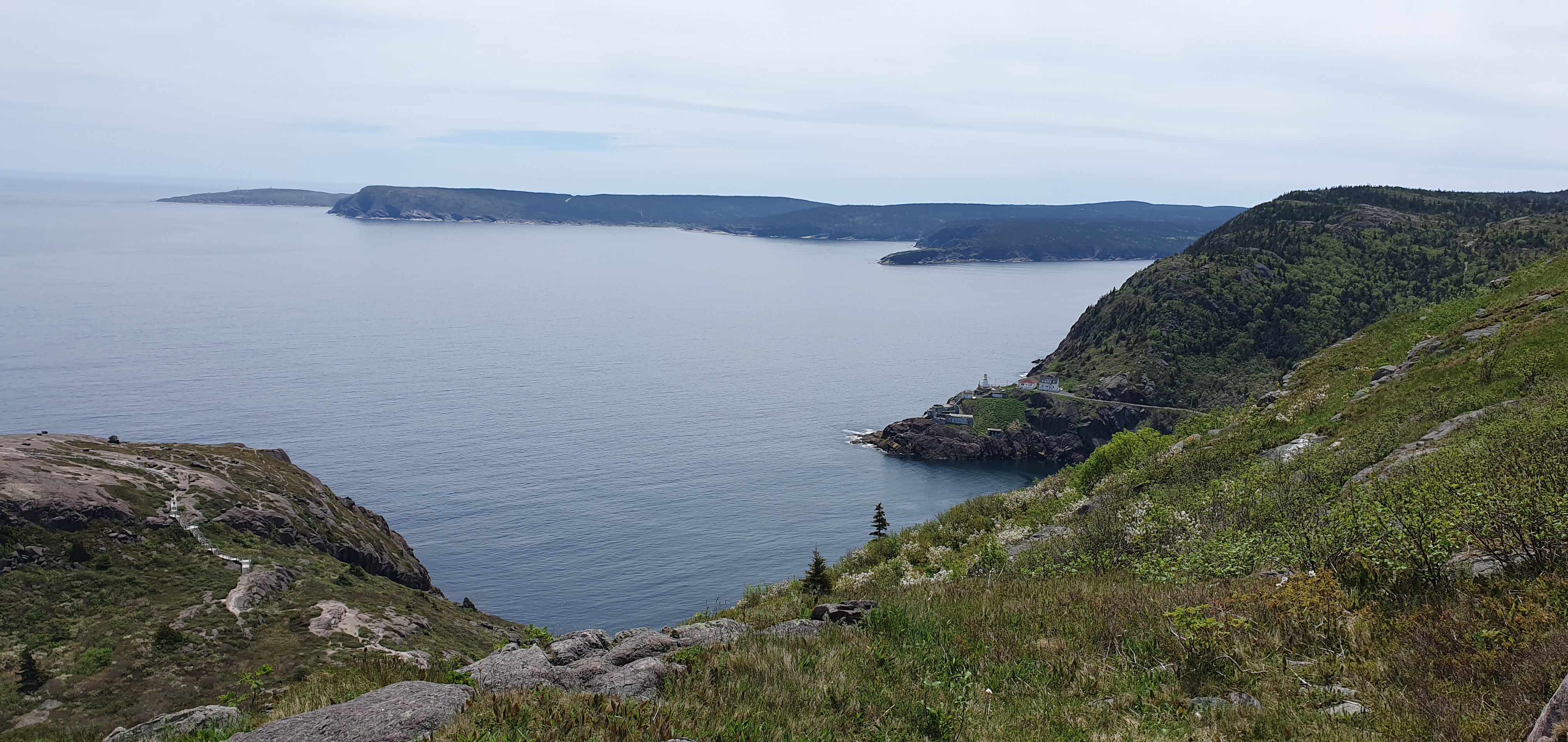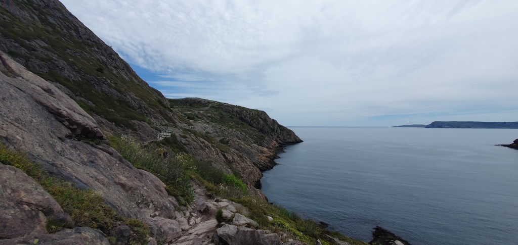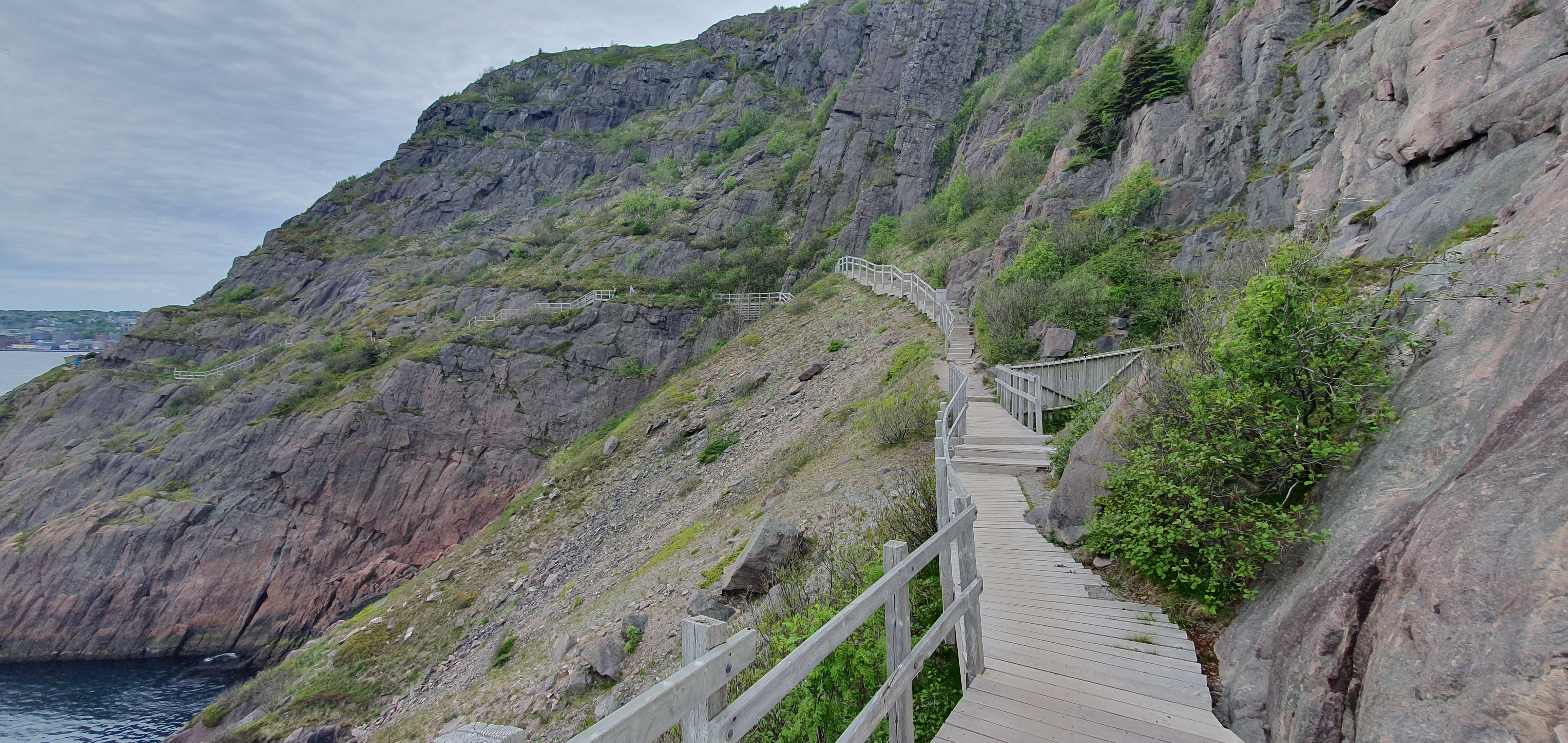 I started the steep descent along the hiking trail leading from Cabot Tower to the Battery neighbourhood below. The weather came over cloudy, and I was glad I brought my jacket after all.