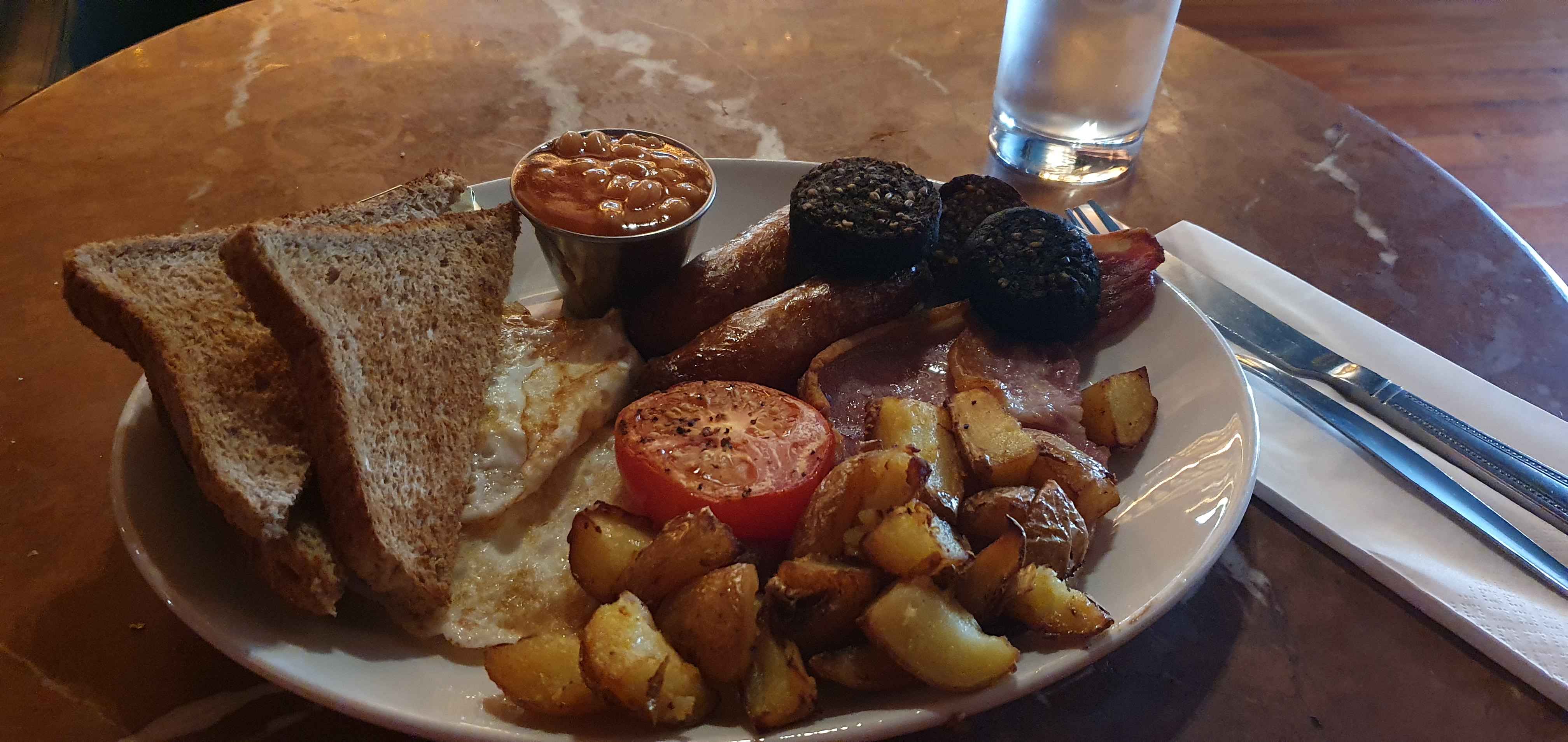 Sunday was wet, wet, wet. I wandered aimlessly around the streets of Galway, watching street performers contend with the rain. But I had no real direction. I had brought my clipboard with me to write some letters and start work on a new short story, but I couldn’t find anywhere that I felt like I wanted to sit and write. I eventually settled on the Merchant’s Cafe and ordered myself an Irish Breakfast.
